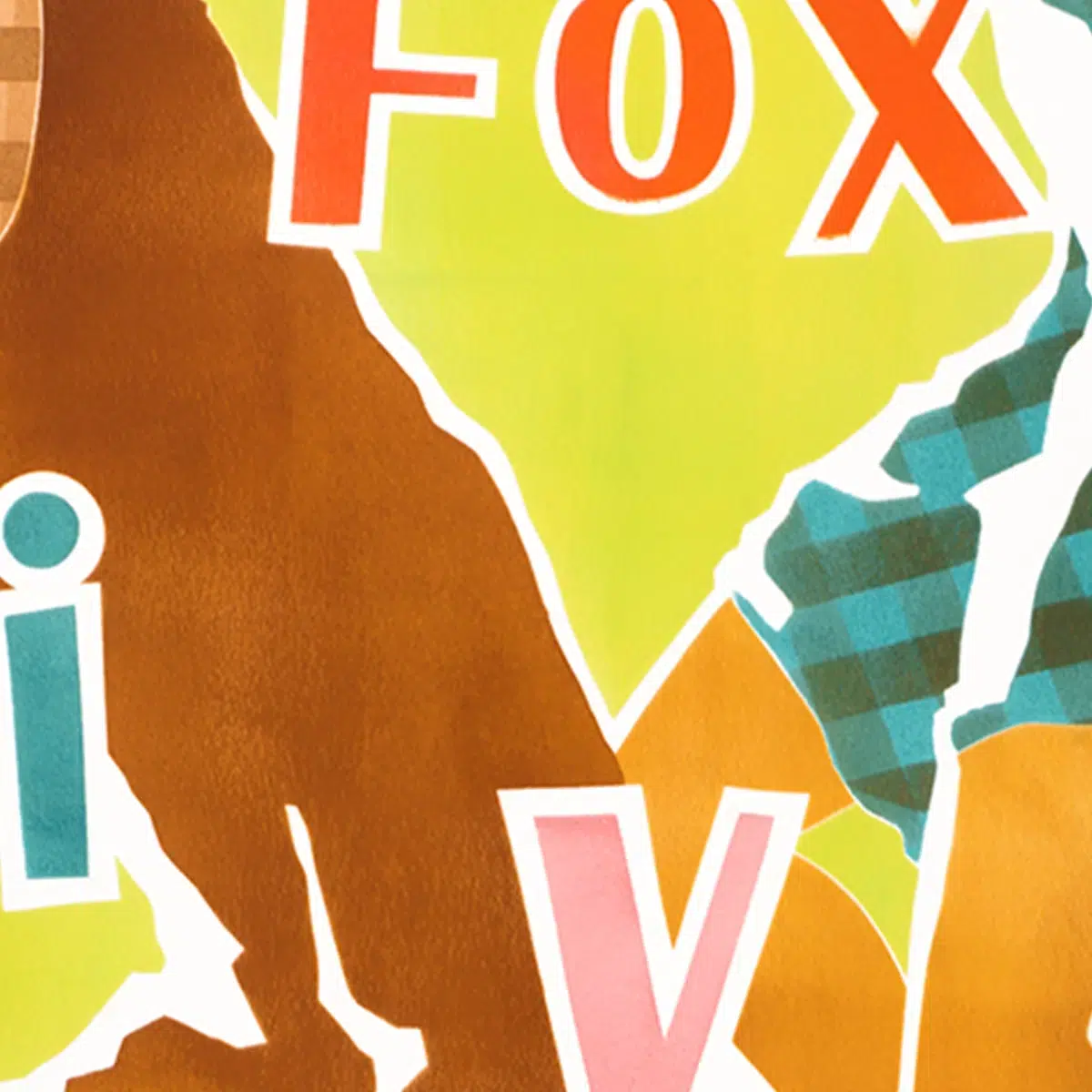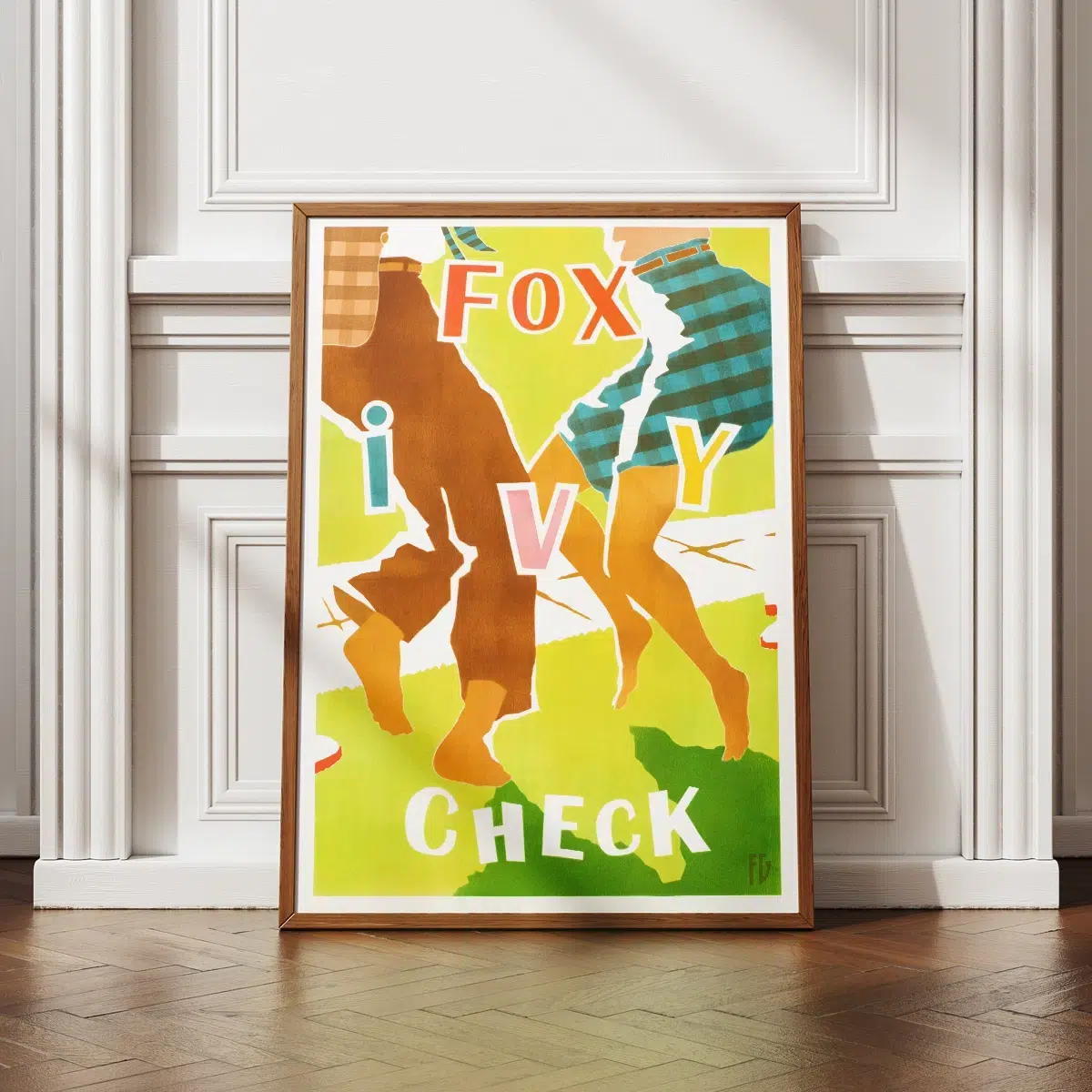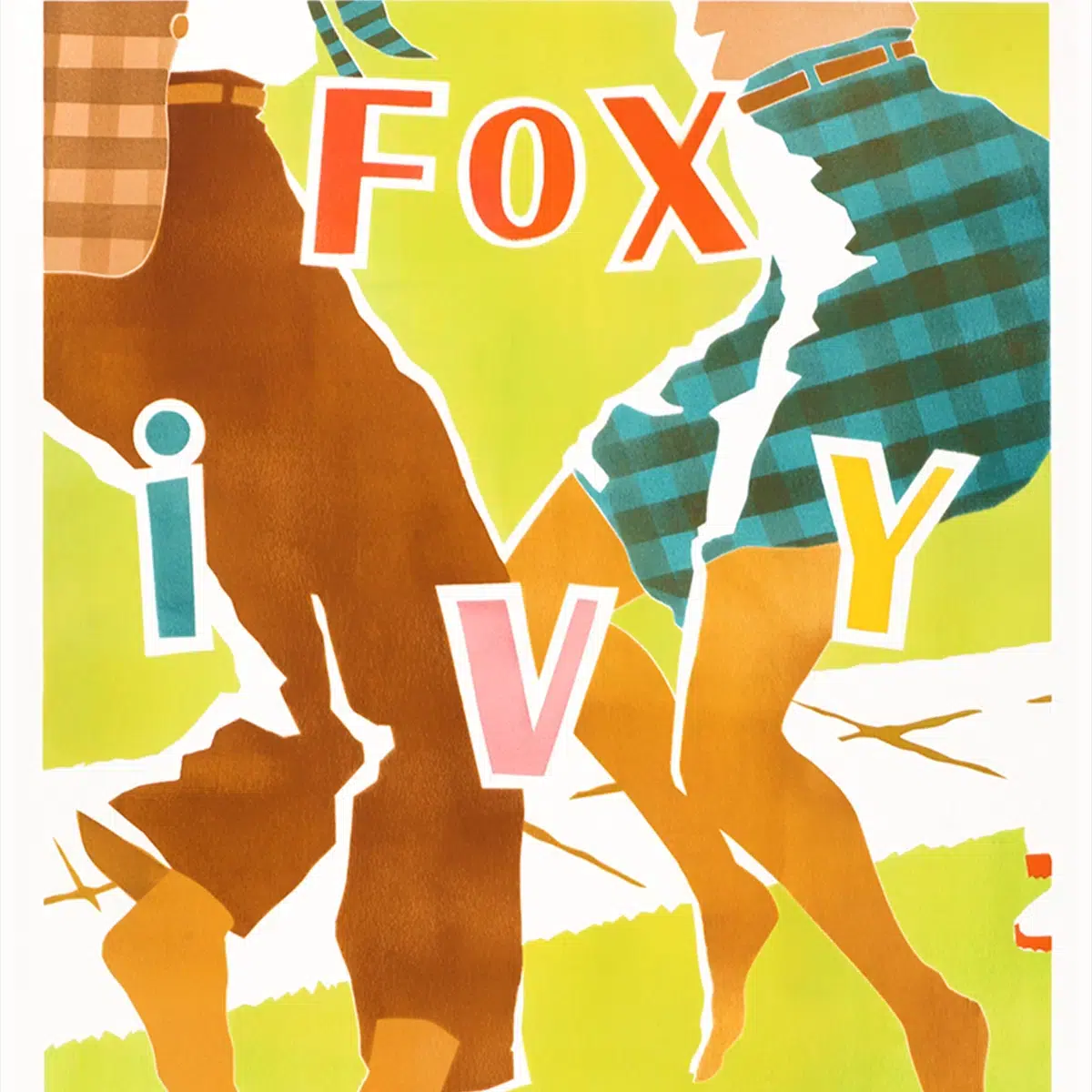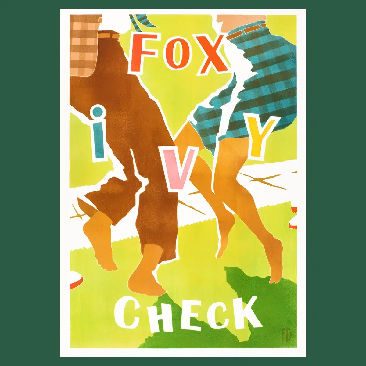 « Fabriqué pour les fabricants de tissus de renommée mondiale Fox Brothers. Inspiré du style de la Ivy League, ce tissu à carreaux est ici représenté sur un couple d’étudiants, insouciants, dansant le Lindy-Hop dans leur campus. »